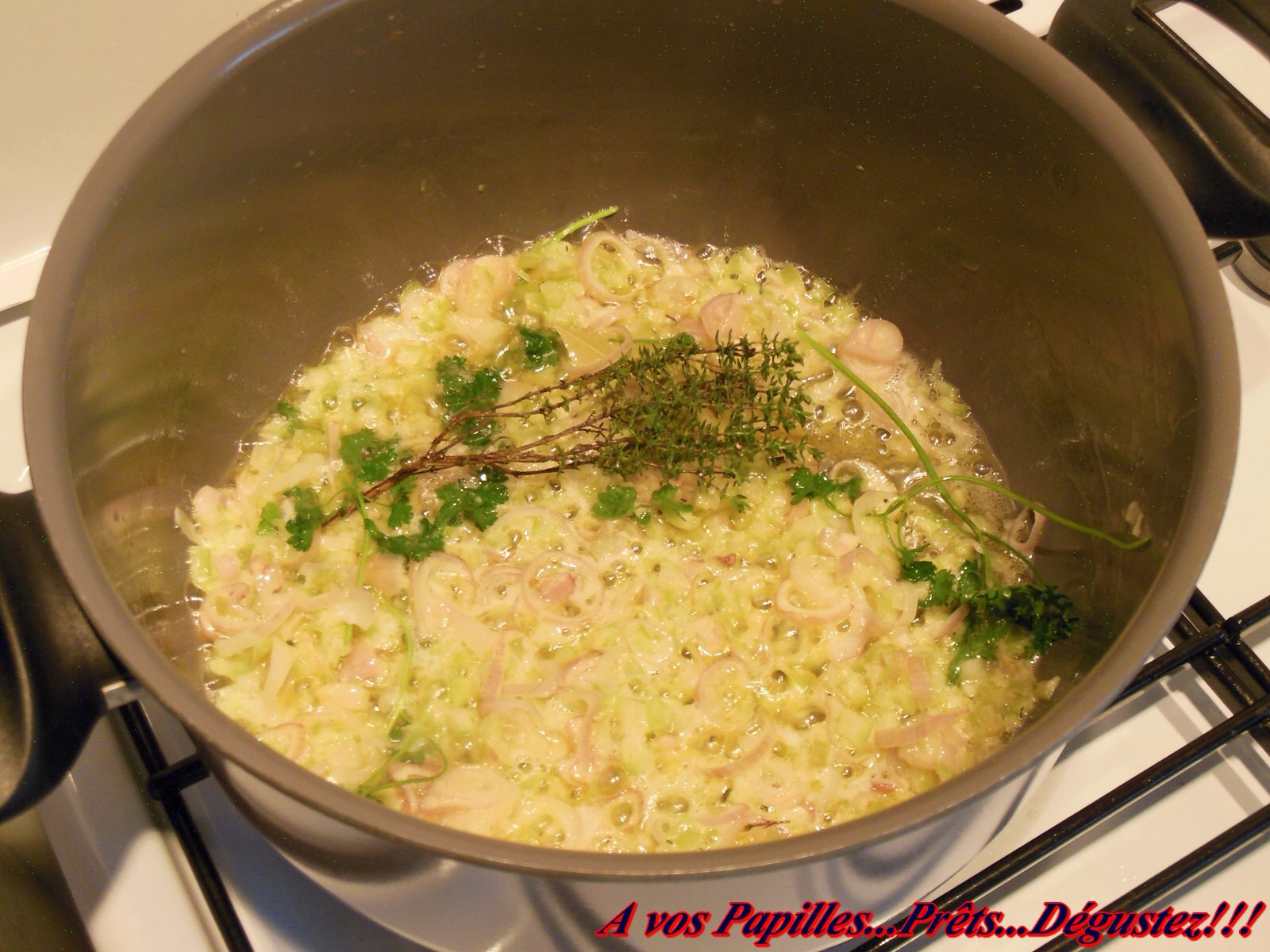 4- Laisser sur feu vif en remuant régulièrement pour que l’ensemble soit bien imprégné du fond au vin blanc.